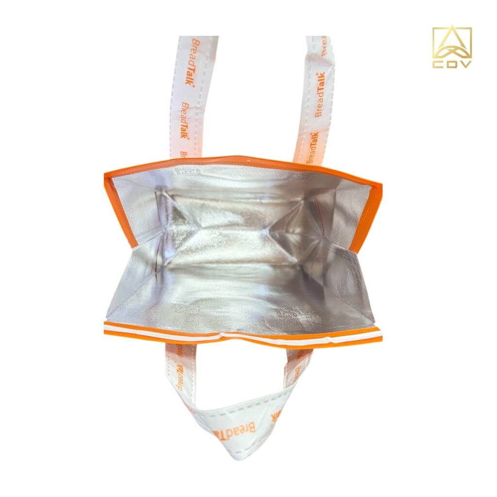 ผ้าสปันบอนด์เคลือบฟอยล์ เป็นผ้าใยสังเคราะห์ที่นำไปประกบกับฟอยล์อลูมิเนียม เพื่อเพิ่มคุณภาพให้เก็บความร้อน-ความเย็นได้นานถึง2-3ชั่วโมง กันน้ำได้ทนทานกว่าผ้าปกติ สายของตัวกระเป๋าเป็นสายผ้าสปันบอนด์สำเร็จรูป